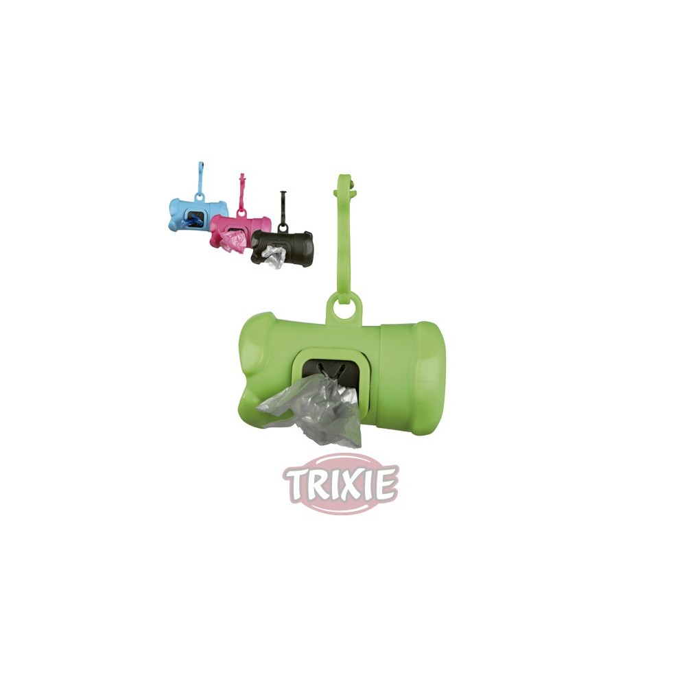 Dispensador de plástico con forma de huesito limpio y fácil de colgar.Tiene una apertura lateral que permite coger la bolsa de basura fácilmente y un gancho para correa o cinturón.