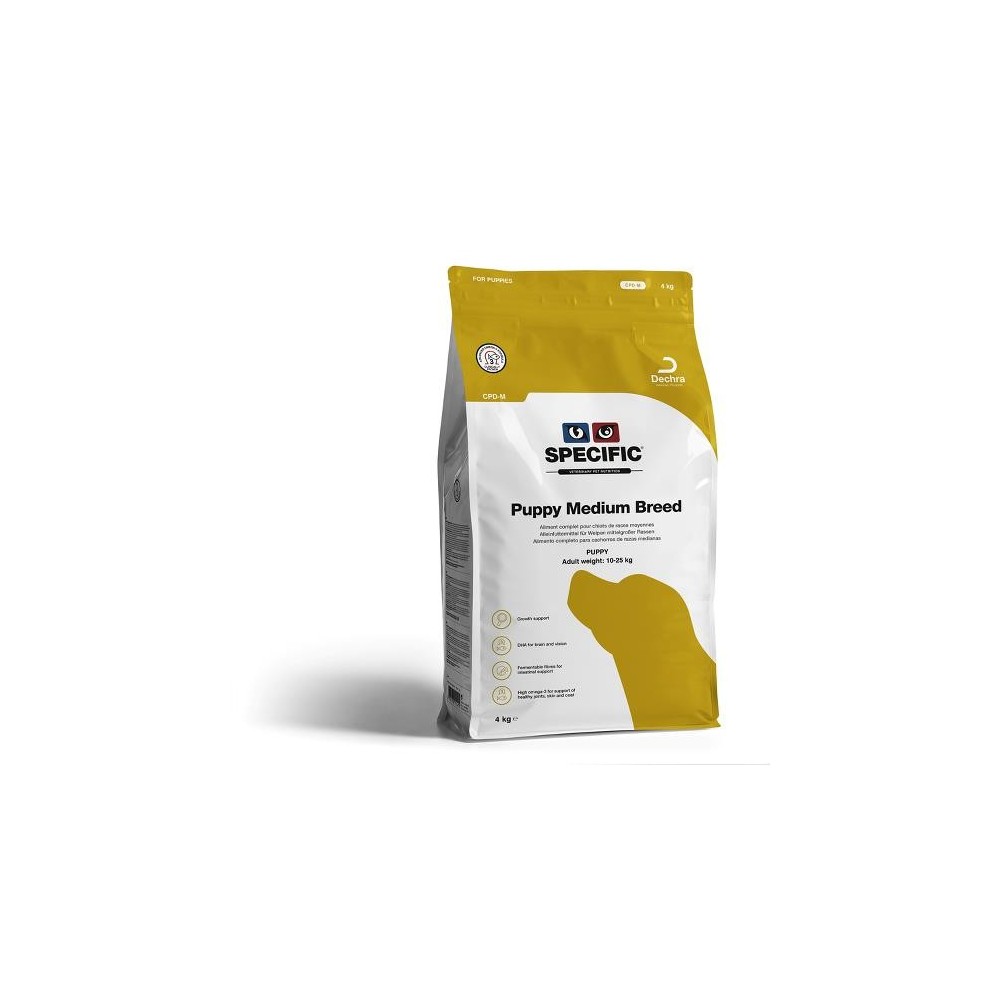 SPECIFIC™ Medium Breed Puppy est un aliment complet et équilibré. Il contient toutes les vitamines et tous les minéraux nécessaires à une croissance saine et avec des niveaux élevés d'oméga-3 de poisson pour soutenir le développement des yeux, du cerveau, de la peau, des cheveux et des articulations.