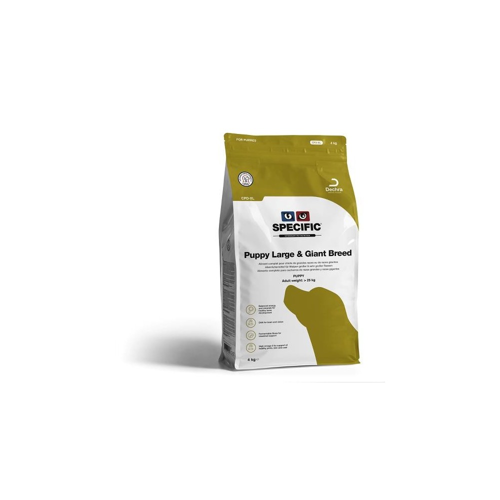 SPECIFIC™ Large and giant breed puppy está formulado con un contenido moderado de energía y calcio para favorecer el desarrollo de articulaciones y esqueleto sanos y reduce el riesgo de crecimiento acelerado o aumento de peso. Para cachorros de razas grandes de más de 25 kg de peso adulto.